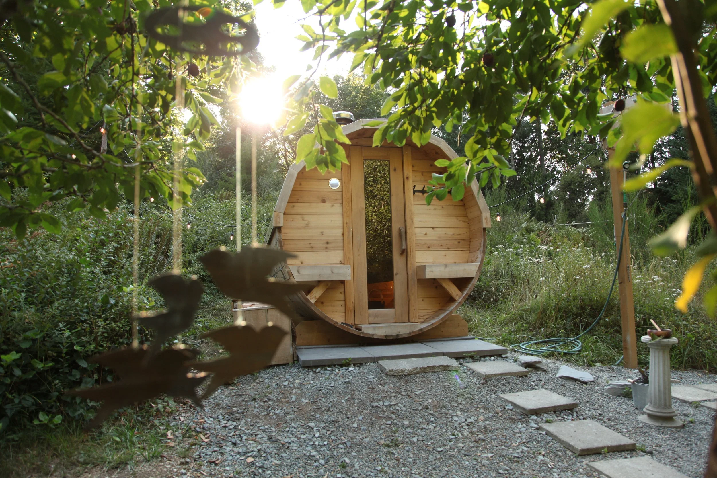 Our wood-fired cedar sauna is an outdoor sauna set in a quiet forest environment. Heated slowly by fire and built from natural materials, it offers deep, enveloping warmth that supports sweating, rest, and reconnection with the body — without schedules or instruction.
