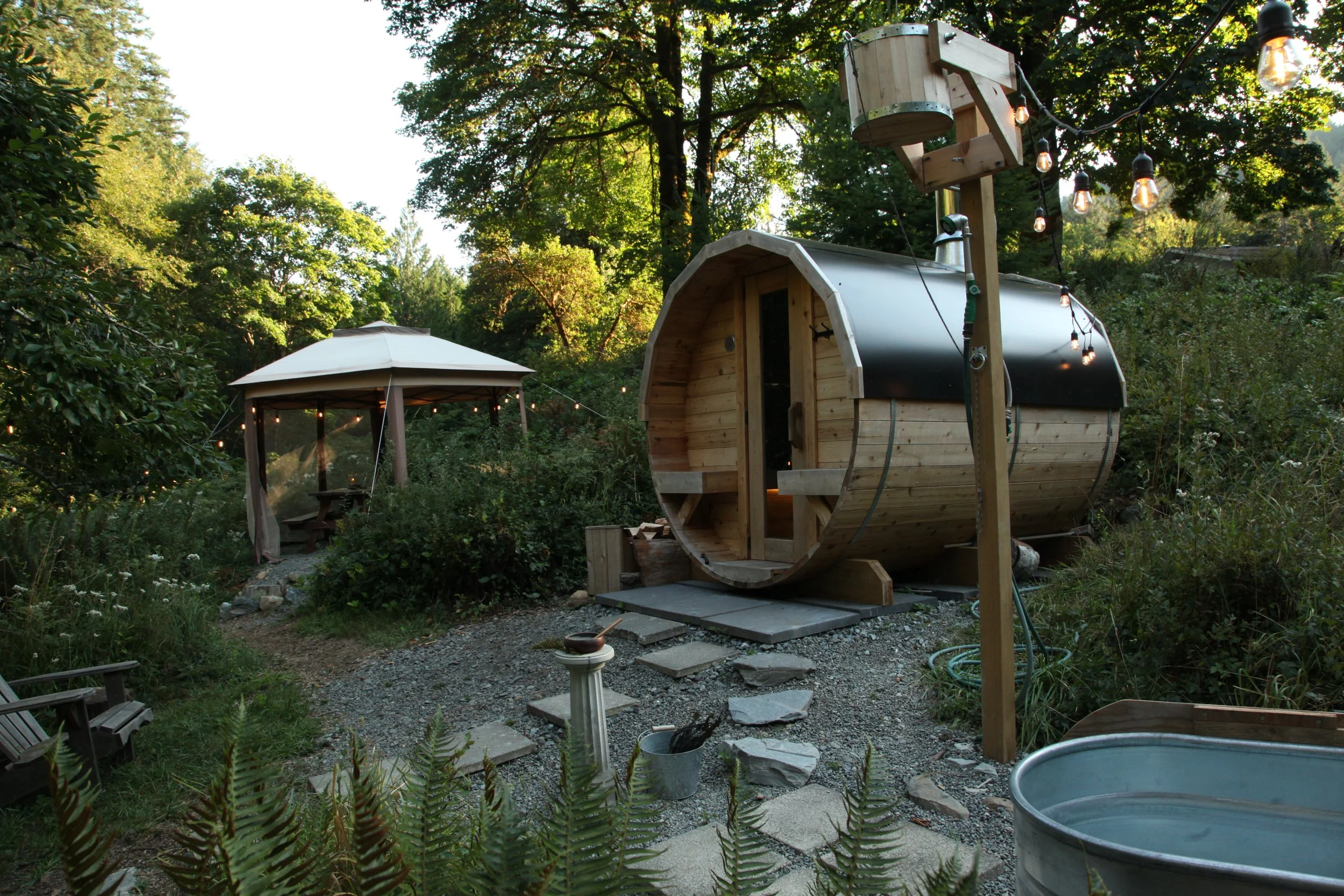 Cold water options include a cold plunge and cold splash dump bucket, available for self-directed use. Cold exposure is entirely optional and can be brief or immersive, offering contrast to the heat of the sauna and hot tub while awakening the senses and breath.
